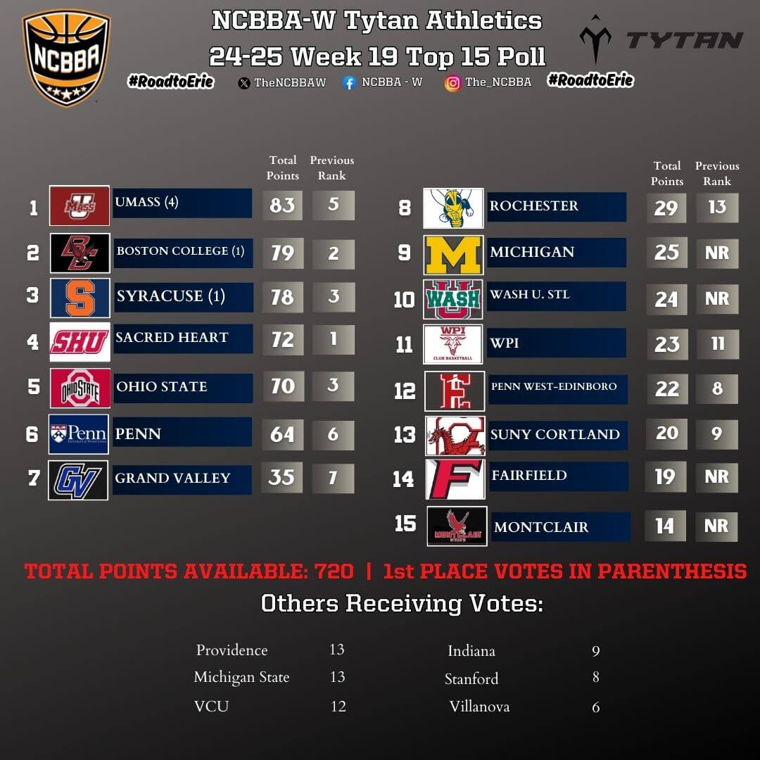 Check out the NCBBA-W Tytan Athletics Week 19 Top 15 Poll to see how the other 10 ranked teams.